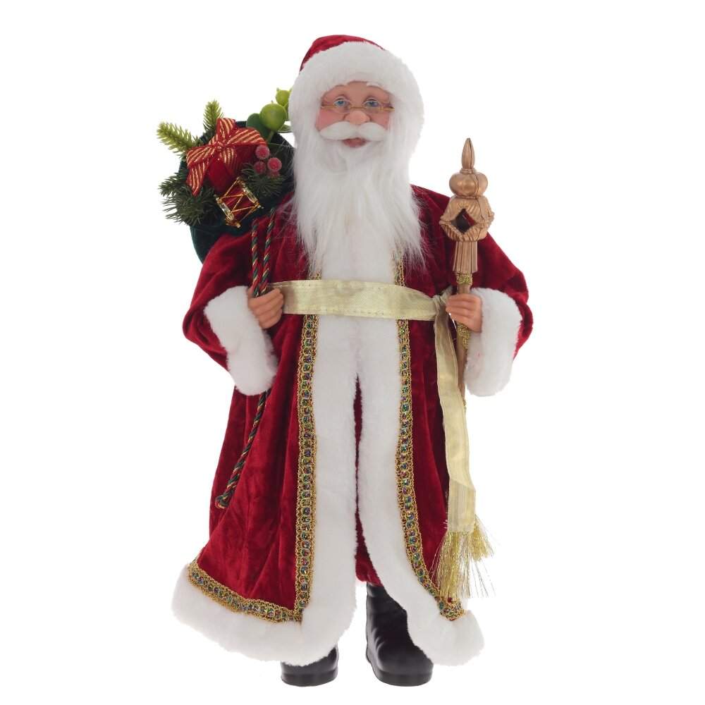 Дед Мороз — интерьерная новогодняя кукла.Он облачен в красную бархатную длинную шубу с белой меховой отделкой, которая придает ему торжественный вид. В руках Деда Мороза зеленый мешок с подарками и посох, что символизирует дух праздника. Лицо, руки и сапоги выполнены из полимерных материалов. Проработанная детализация с добрым выражением и пушистой мягкой бородой добавляет Дедушке Морозу особое обаяние и теплоту, делая его образ более живым и привлекательным. Эта кукла создаст праздничное настроение и станет ярким акцентом в вашем интерьере.