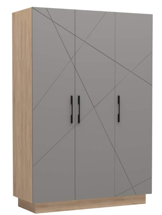 Распашной трехдверный шкаф SPLIT выполнен в современном стиле. Фасады изготовлены из МДФ с рисунком геометрической формы.Наполнение шкафа: штанга для одежды на плечиках и брюк, полки для белья и выдвижные ящики. Дополнительно к шкафу можно приобрести антрессоль для дополнительного места хранения. Петли с доводчиками.