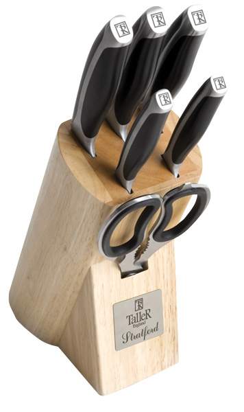 Набор ножей TalleR TR-22008 Стратфорд 5 ножей, ножницы и подставка.Подставка выполнена из каучукового дерева. Лезвия ножей сделаны из твердой коррозионностойкой стали AISI 420S45 (3Cr13). Рукояти выполнены из особого ударопрочного пластика.