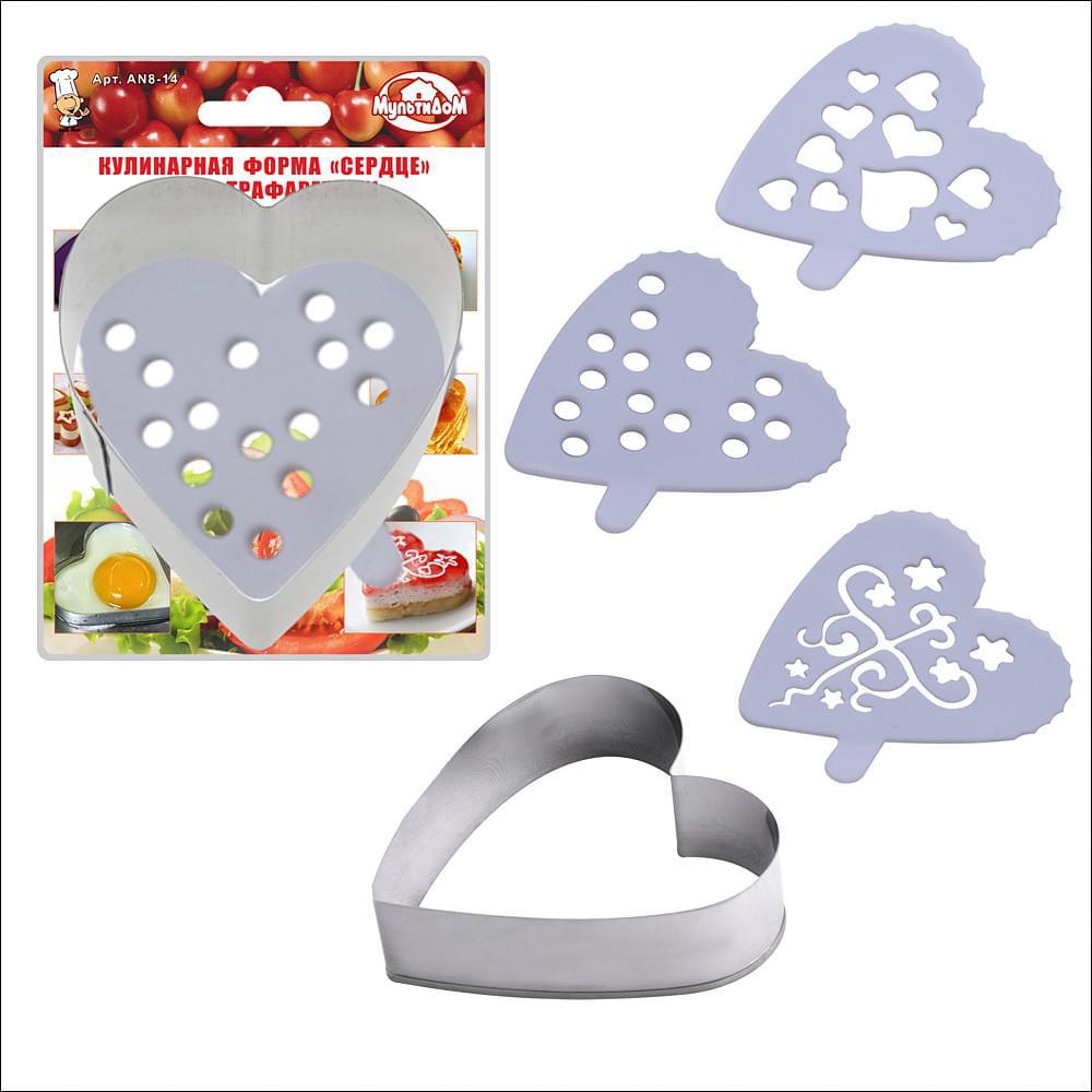 МУЛЬТИДОМ Форма AN8-14 кулинарная Сердце с 3-мя трафаретами 8х7,5х2,5см