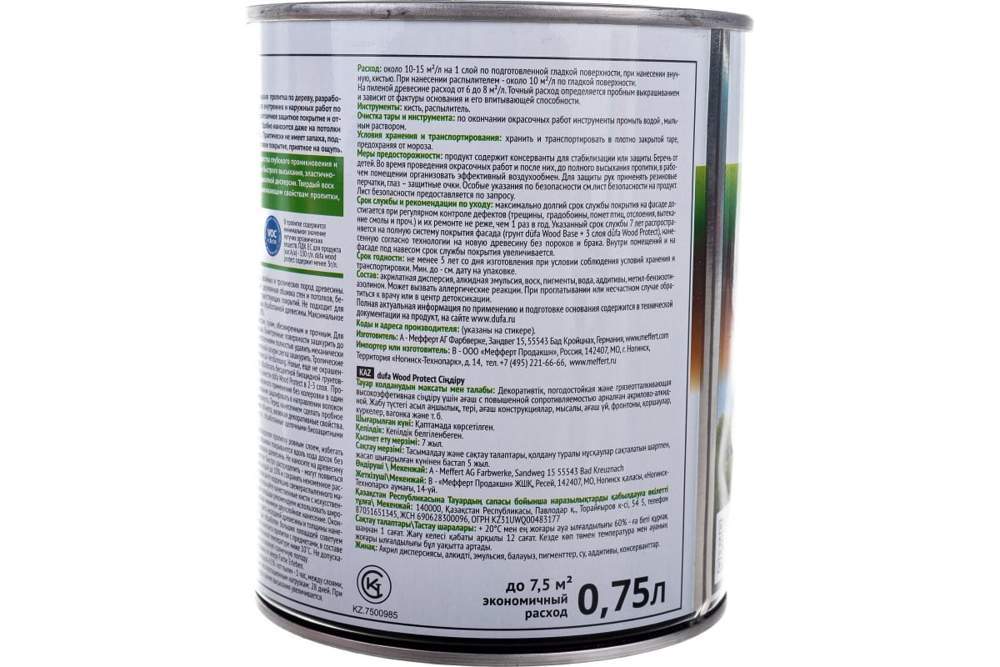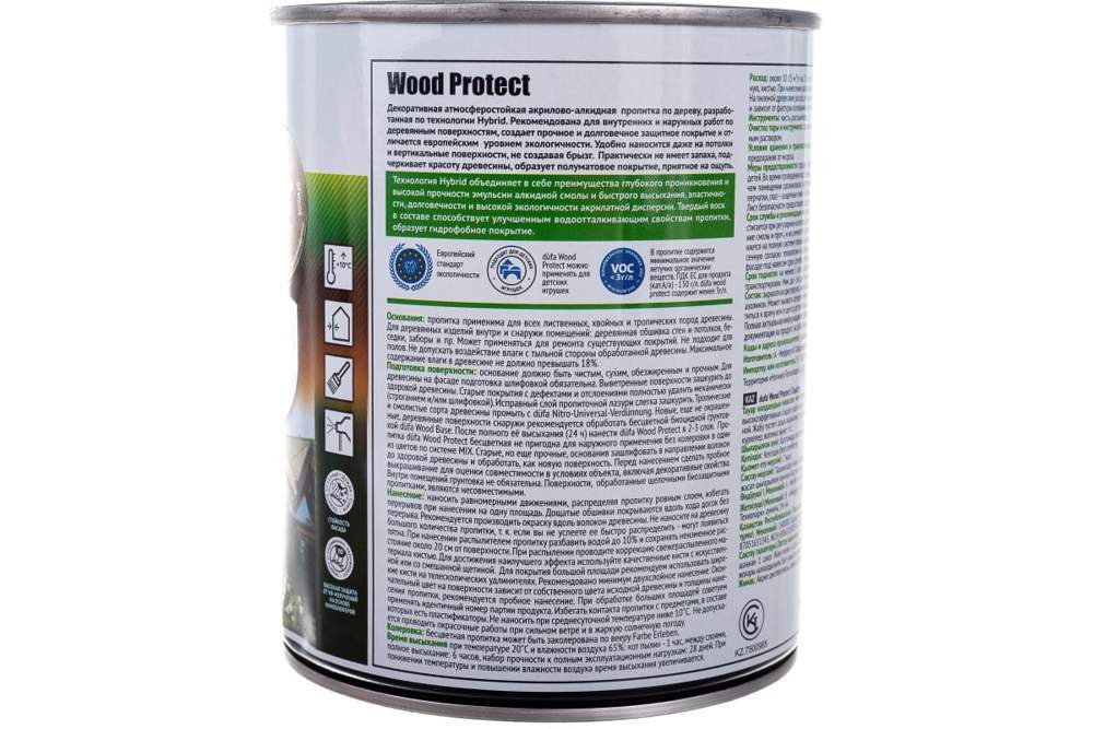 Декоративная, погодостойкая и грязеотталкивающая высокоэффективная пропитка для дерева с повышенной сопротивляемостью погодным факторам на акрилово-алкидной основе. Новая технология пропитки düfa Wood Protect объединяет в себе свойства глубоко проникающей эмульсии на основе алкидной смолы с образующей плёнку акрилатной дисперсией. Твердый воск и натуральные масла, находящиеся в составе, способствует водонепроницаемости, прочности и гидрофобному эффекту поверхности. Такая комбинация дает непревзойденное сочетание долговременной защиты и экологичности, особенно в момент нанесения – как в ручную, так и методом распыления. Входящий в состав твердый воск проникает в структуру древесины и повышает ее износостойкость. Пропитка обладает тиксотропной консистенцией. Применима на большинстве лиственных и хвойных пород деревьев, также подходит для тропической древесины.