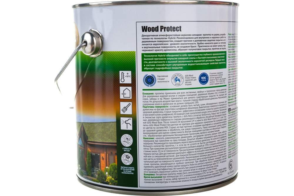 Декоративная, погодостойкая и грязеотталкивающая высокоэффективная пропитка для дерева с повышенной сопротивляемостью погодным факторам на акрилово-алкидной основе. Новая технология пропитки düfa Wood Protect объединяет в себе свойства глубоко проникающей эмульсии на основе алкидной смолы с образующей плёнку акрилатной дисперсией. Твердый воск и натуральные масла, находящиеся в составе, способствует водонепроницаемости, прочности и гидрофобному эффекту поверхности. Такая комбинация дает непревзойденное сочетание долговременной защиты и экологичности, особенно в момент нанесения – как в ручную, так и методом распыления. Входящий в состав твердый воск проникает в структуру древесины и повышает ее износостойкость. Пропитка обладает тиксотропной консистенцией. Применима на большинстве лиственных и хвойных пород деревьев, также подходит для тропической древесины.