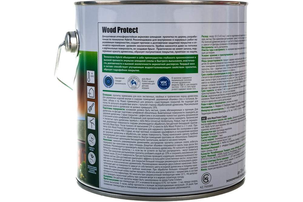 Декоративная, погодостойкая и грязеотталкивающая высокоэффективная пропитка для дерева с повышенной сопротивляемостью погодным факторам на акрилово-алкидной основе. Новая технология пропитки düfa Wood Protect объединяет в себе свойства глубоко проникающей эмульсии на основе алкидной смолы с образующей плёнку акрилатной дисперсией. Твердый воск и натуральные масла, находящиеся в составе, способствует водонепроницаемости, прочности и гидрофобному эффекту поверхности. Такая комбинация дает непревзойденное сочетание долговременной защиты и экологичности, особенно в момент нанесения – как в ручную, так и методом распыления. Входящий в состав твердый воск проникает в структуру древесины и повышает ее износостойкость. Пропитка обладает тиксотропной консистенцией. Применима на большинстве лиственных и хвойных пород деревьев, также подходит для тропической древесины.