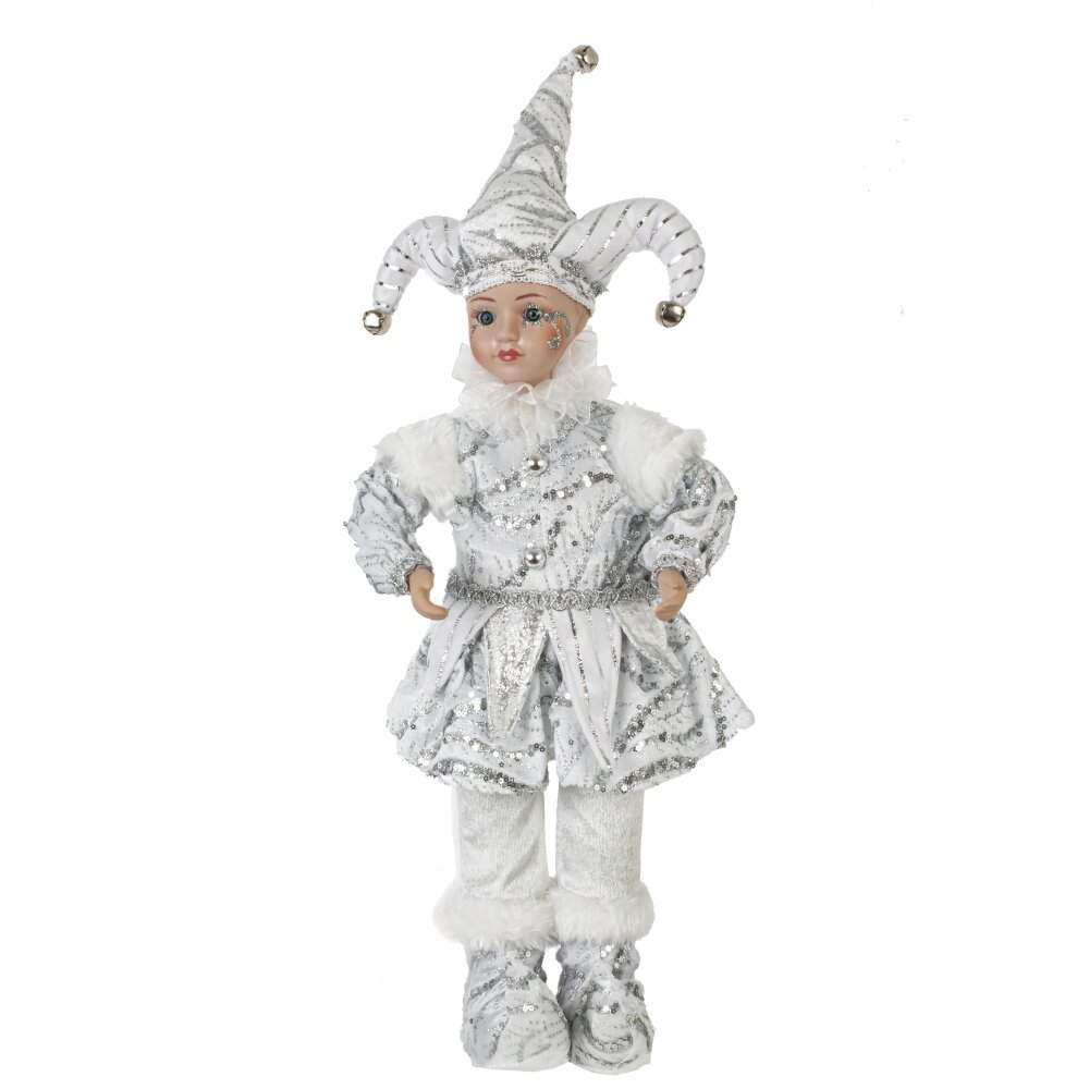 Костюм клоуна выполнен в роскошных бело-серебристых оттенках, которые эффектно переливаются на свету.