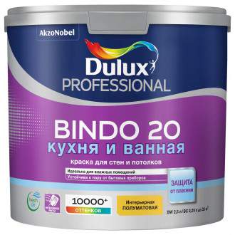 Краска Dulux Professional Bindo 20 полуматовая водно-дисперсионная краска для высококачественной отделки стен и потолков во влажных помещениях, таких как кухни, ванные комнаты, санузлы, прачечные и др. Покрытие устойчиво к пару от бытовых приборов (пароварка, чайник, отпариватель и т.д.) и конденсату. Наносится без брызг и потеков с нейтральным запахом. Экологичность подтверждена эко-сертификатом ""Листок Жизни"". Сертифицирована для применения в детских и лечебно-профилактических учреждений, а также объектах пищевой промышленности. Подходит для нанесения на полностью просохшие минеральные поверхности (бетон, штукатурку, кирпич и т. п.), гипсокартон, обои под покраску. Перед применением разбавить в рекомендованной пропорции для первого слоя (1 к 10) и тщательно перемешать. Рекомендуется наносить в два слоя при температуре от +5 °C до +30 °C, относительной влажности воздуха от 40 до 80 %. Используйте кисть с синтетическим ворсом, валик для водно-дисперсионной краски или распылитель.Нанесение с помощью краскопульта: